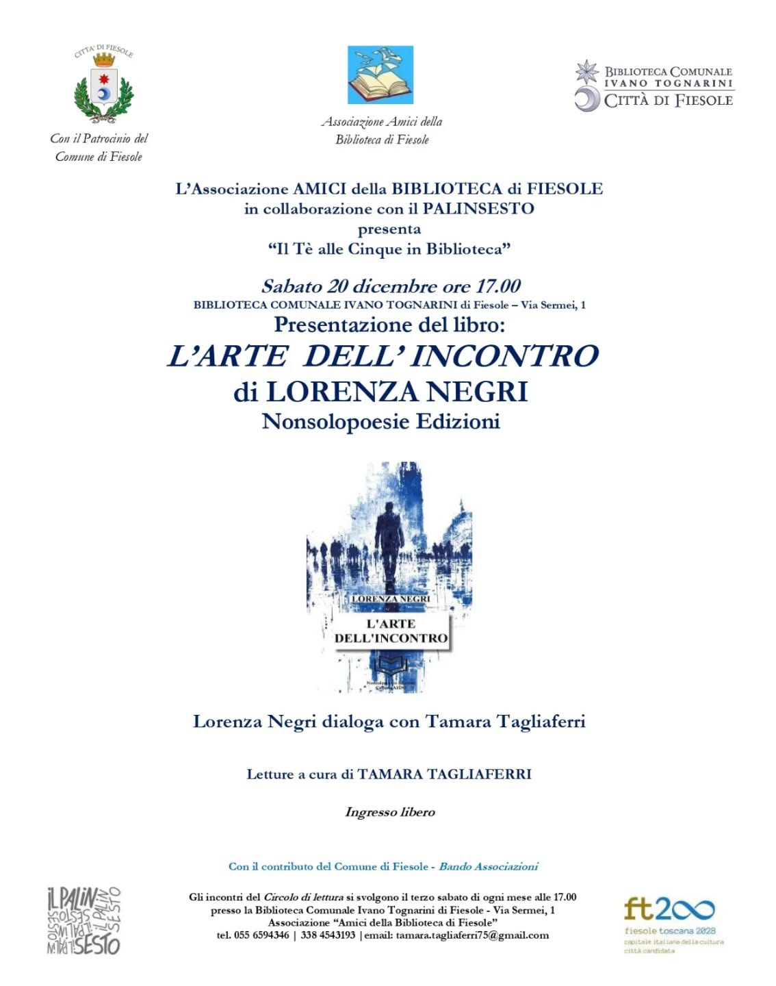 Sabato 20 dicembre, alle ore 17.00, l' Associazione Amici della Biblioteca di Fiesole, nell'ambito del ciclo di incontri "Il Tè alle Cinque in Biblioteca", organizza la presentazione del libro "L'arte dell'incontro" di Lorenza Negri