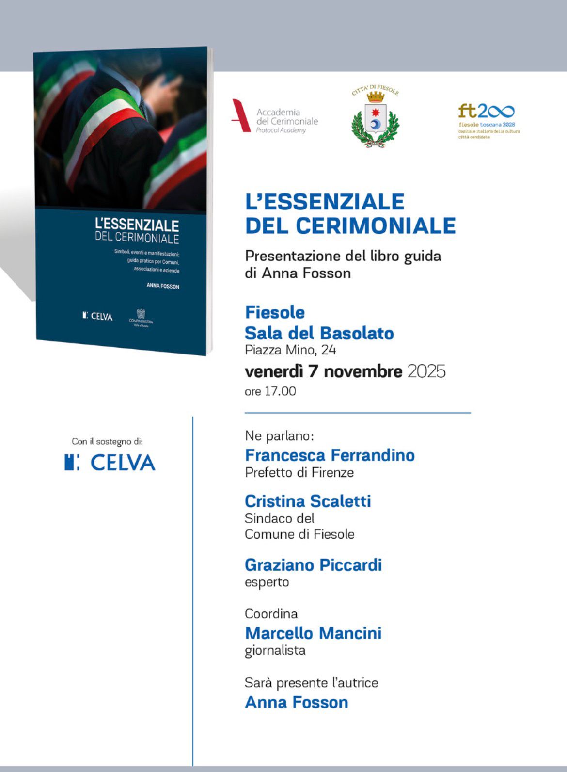 L'autrice, Anna Fosson, parlerà delle regole del cerimoniale presentando il suo manuale "L'essenziale del cerimoniale - simboli, eventi e manifestazioni: guida pratica per comuni associazioni e aziende."